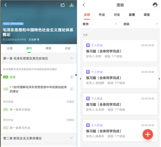 自2月初启动网络授课以来,短短两周时间,学院积极申请对接各大在线课程平台,最终各门思政课均采用国家教育部推荐的人民数字马院“优学院”教学平台,完成本学期线上教学慕课的搭建,建设在线资源库(教材、课件、视频)、作业与测试、讨论专区,实现在线教育教学、辅导答疑、作业批改,签到考试等多项功能。《概论》课又依托精品在线开放课程项目,在国家级教学平台中国大学MOOC建设学校专属的SPOC课程,作为在线教学资源的补充教学方式,上传问题式教学课件、微课视频、作业测试等,内容覆盖所有章节的重难点问题,引导学生观看视频、自学讲义、完成作业。