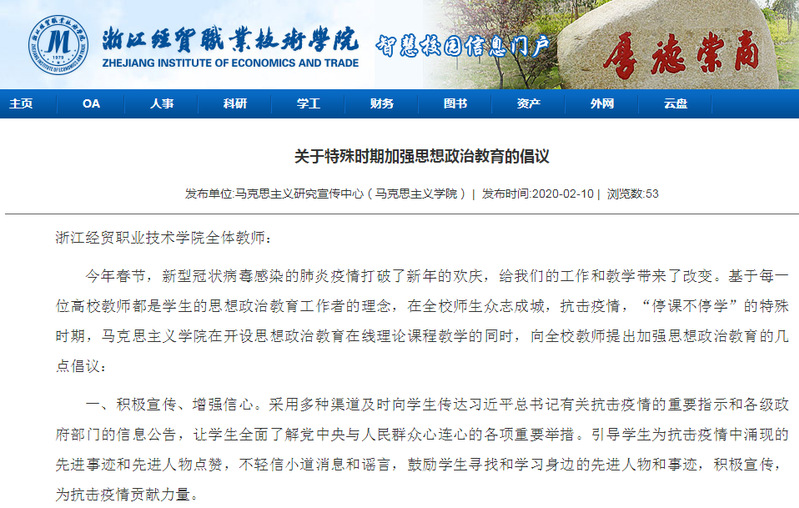 “疫情就是最好的教材”,如何把全校师生抗击疫情的生动故事搬到在线“空中课堂”,成为思政课的“活”教材?马院充分发挥基层党组织的战斗堡垒作用和党员的先锋模范作用,由浙江省高校思想政治理论课名师工作室负责人王兆婷老师带领教学团队,精心组织抗疫专题思政课,充分挖掘疫情防控中的育人元素,引导学生正确认识当前疫情,认识中国特色社会主义制度集中力量办大事的巨大优势,进一步坚定青年学生的“四个自信”。浙江省高校思政课教师教学比赛获奖者沈楼老师的《中国近现代史纲要》,向食品安全201901和201902本科班学生,讲述了中国古代瘟疫的历史与记载。课后,同学们纷纷表示,一线抗疫医护人员让人钦佩,党和政府疫情防控坚决有力,中华民族空前团结;作为新时代大学生,面对疫情要客观、理性,不造谣、不信谣、不传谣,在家期间要加倍努力学习。